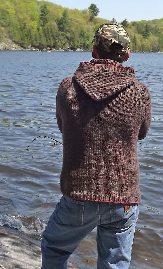 The sweater is an easy knit, with top down raglan construction worked mostly in the round, beginning at the hood. It should fit loosely with approx 6-8 inches/15-20.5 cm of positive ease.