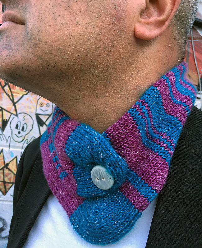 This scarf, then, is two fraternal socks in colors reminiscent of the metallic leather suits Gord wore on the tour -- in magenta and turquoise. The first suit of the night was made from silver hologram leather, and so Kate used a silver hologram carry-along thread to give the scarf sparkle. As shown, Kate's version (shown above) wraps generously around the neck once. If you'd like to wear it, as Gord does to the right, wrapped twice around your neck and buttoned at the toe, make the leg portions significantly longer.