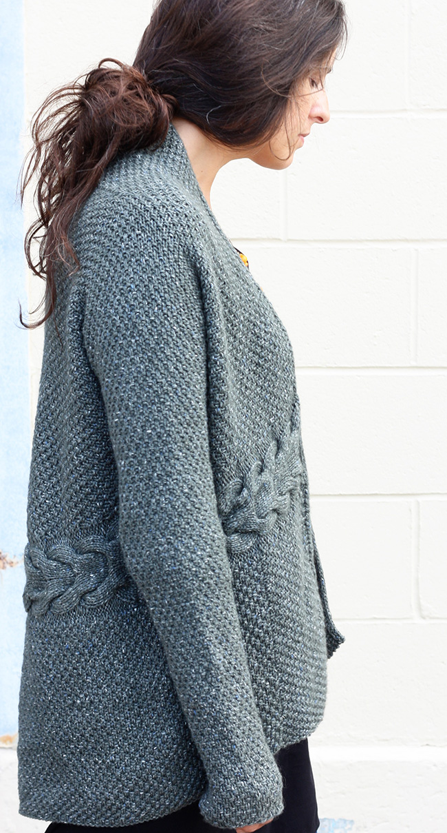 Laurel cardigan sweater, a free knitting pattern from Knitty.com. Free knitting pattern for a flowy cardigan with a cabled band at the waist.