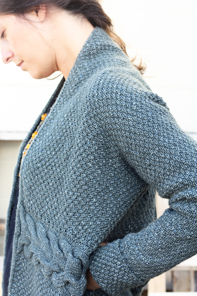The Laurel Cardigan is all the things I love to knit: Big squishy cables, lots of simple stitch texture, some simple shaping to keep things interesting and easy construction. Combined with the things I love to wear: easy-fit oversized cardigans that double as jackets, extra-long sleeves that cuff nicely as needed, and a generous shawl collar that doubles as an overlapping front.