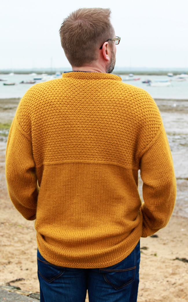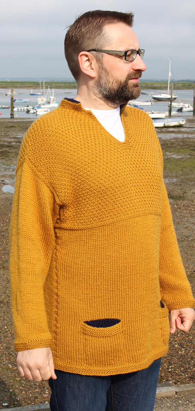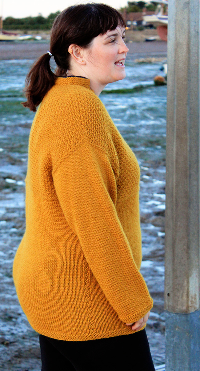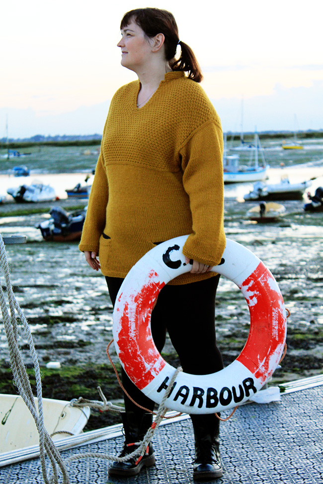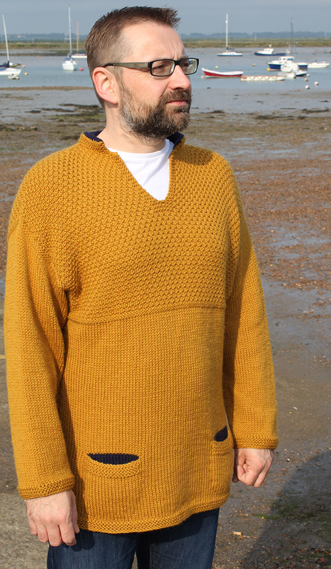 With a textured yoke, mock seams, front pockets and short collar, this sweater takes inspiration from both traditionallocal artist’s smocks and fisherman’s ganseys. Mersea Island is designed to be worn as a top layer so it is oversized and intended to be worn with 4-6 inches /10-15 cm of positive ease.