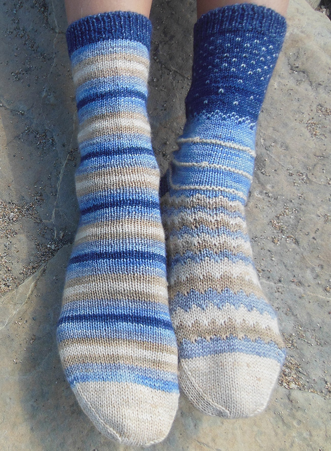 When I received my little package of small skeins from Never Enough Thyme, I envisioned a pair of mismatched socks, playful with an abundance of different patterns. However, as I worked with the yarn, my memories of that day and evening at Mont St. Michel kept coming back into my mind. These socks are mismatched, one embodying the actuality of that moment of looking out towards the sea from the cozy dining room and the second leaving reality behind (as memories often do) to reveal just the colors and lines.