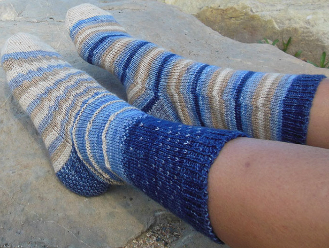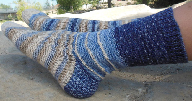 Through the gusset of the sock, work a stripe sequence of E, D, C in 4-round bands.