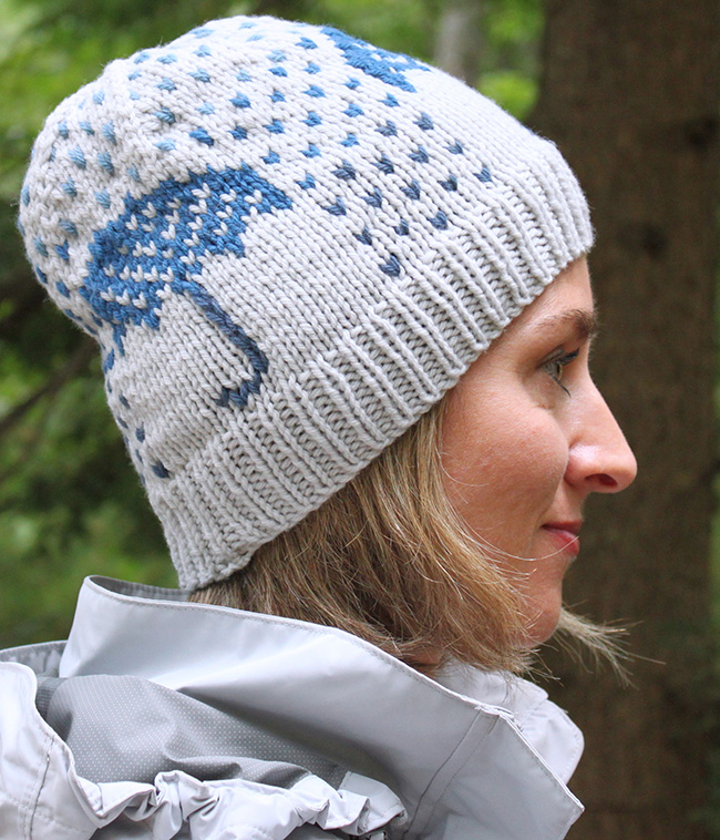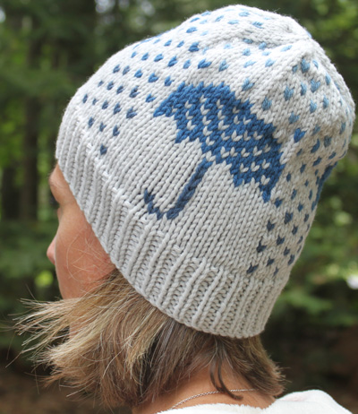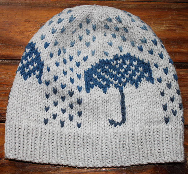 This hat features a fun, easy and whimsical stranded umbrella and rain motif. I chose rainy colors: shades of blue that transition from dark to light on a background of pale gray.