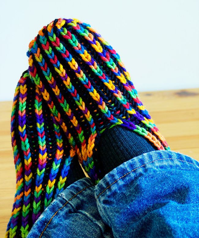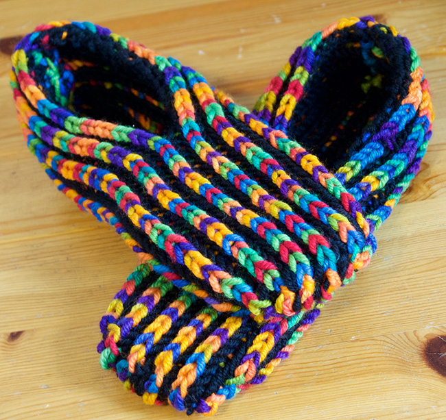 Uberib slippers, a free knitting pattern from Knitty.com. Free knitting pattern for a pair of thickly ribbed slippers worked in two-color brioche.