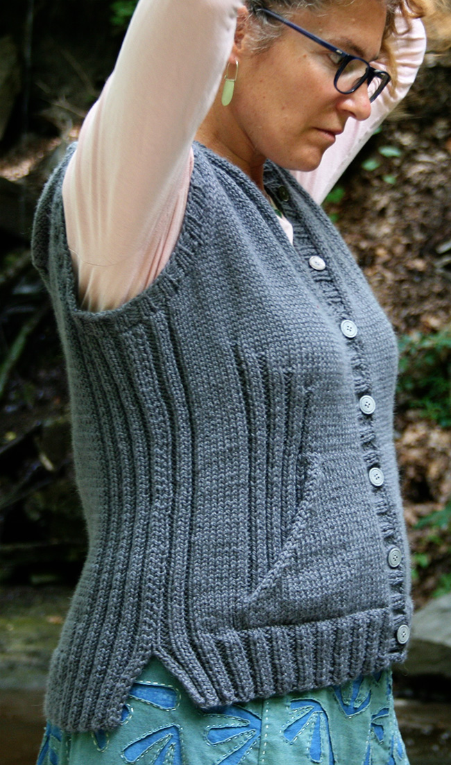 I moved recently to a town outside of Boston whose morning streets are dominated by busy parents getting to the errands of their day while kids are at school. I have to admire their pluck, their practical energy of taking care of their families, and to respect their get ‘er done togs. As a designer, I am prone to flights of fancy, of slightly arty interpretations of whatever I am obsessed with at the moment. Not everything I knit is something you can throw over your yoga clothes or pop on to pick up a quart of milk. So in the spirit of my new neighborhood, I have interpreted the casual outer layer of late fall in New England, the puffy vest.