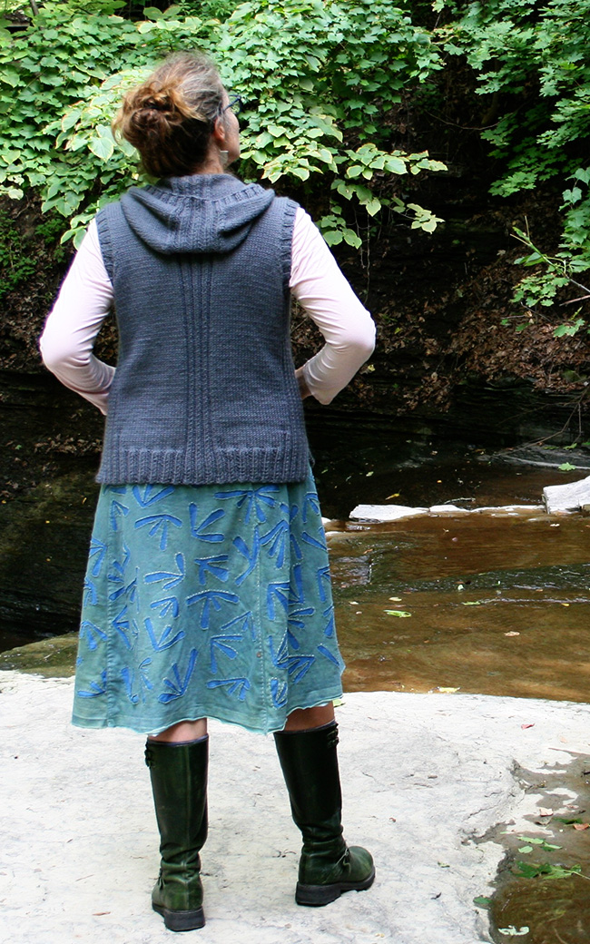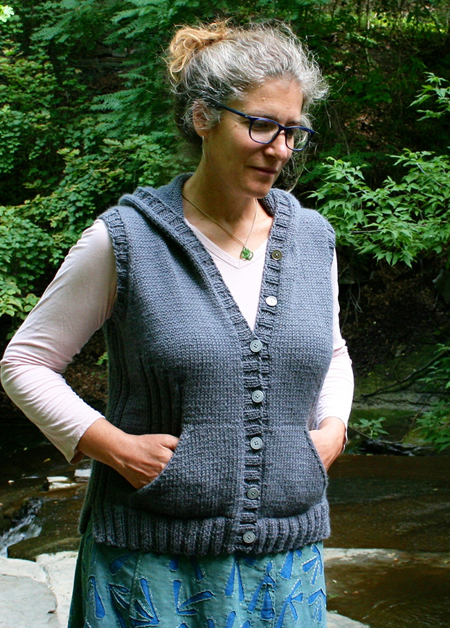 Viatori vest, a free knitting pattern from Knitty.com. Free knitting pattern for a hooded vest with button closure.