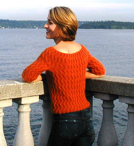 completely in the round with minimal finishing.  This modern aran sweater, knit totally in the