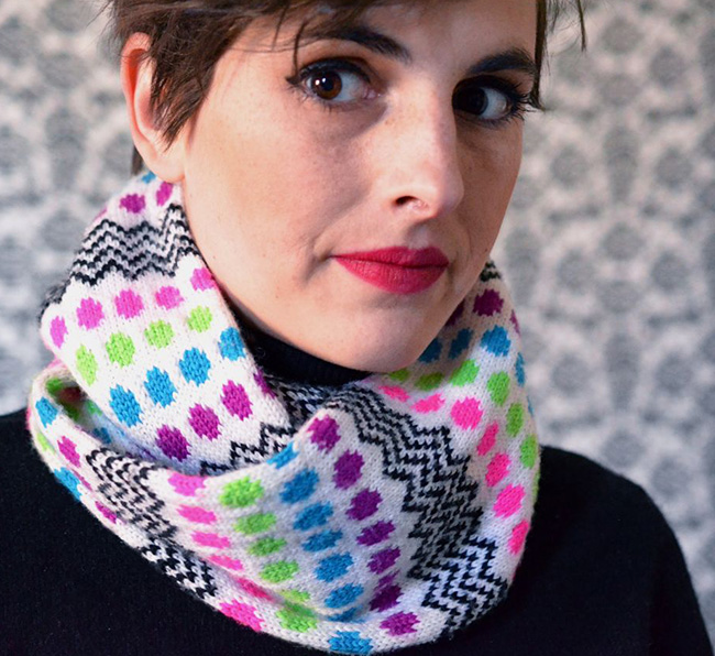 Candy Dots cowl, a free knitting pattern from Knitty.com. Free knitting pattern for a cowl featuring colorwork. Offered in two sizes.