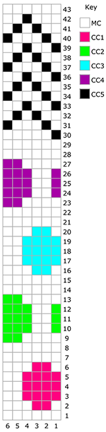 As gauge can differ when worked flat vs. in the round, gauge swatch should be done using colorwork pattern in the round to get most accurate measurements.