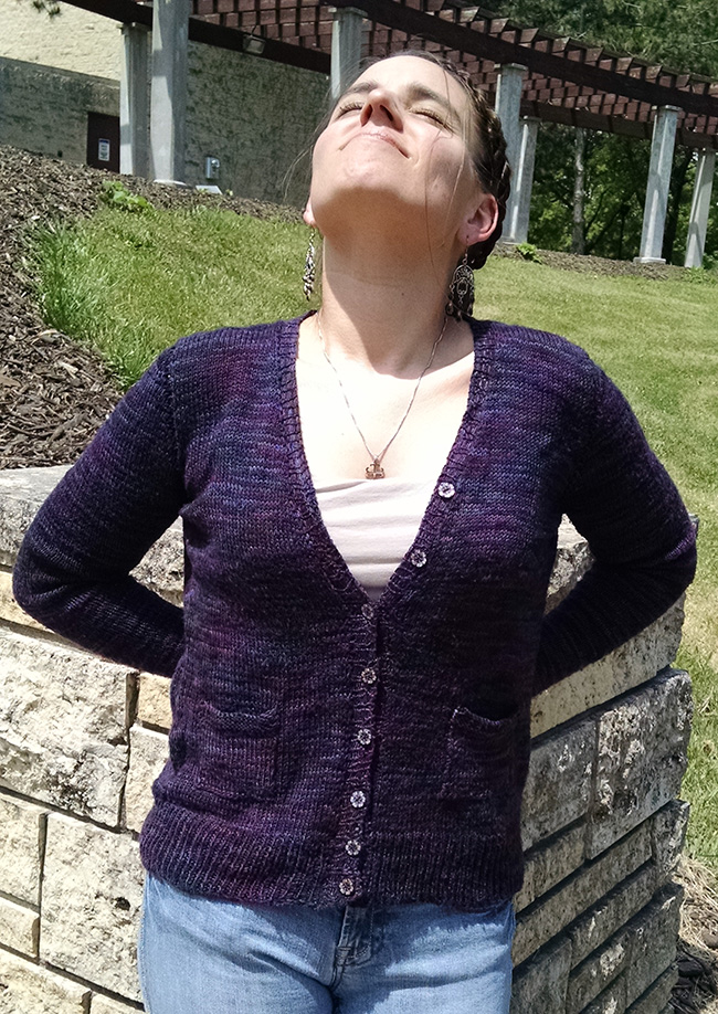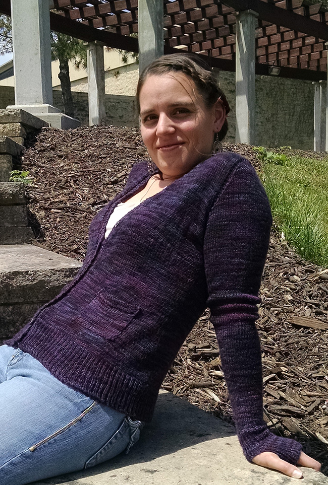 Sofia is worked in one piece from the hem to the underarms, then worked separately for the fronts and back. Neck and armhole shaping is worked at the same time. Shoulders are joined using three-needle bind off, and sleeves picked up from the underarms with short rows and worked down the cuffs. A button band is picked up from the fronts and back neck, with buttonholes placed using one-row buttonholes. Pockets are worked separately and sewn on to the fronts after completion.