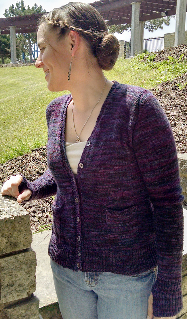 Weave in ends. Block to schematic measurements. Sew on button. Sew pockets to fronts, using photos for guidance, placing bottom edges 1 inch/2.5 cm above ribbing. Weave in and cut remaining ends.