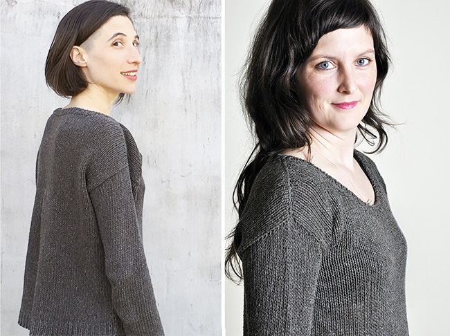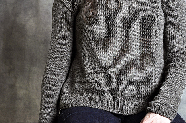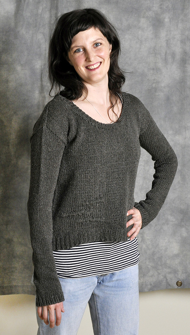 This is a great loose-fitting layering piece that's mostly super-simple and quick to knit. The front and back are worked flat and seamed at the shoulders and sides. Drop sleeves are picked up and worked in the round until they're exactly the right length. Simple 1x1 ribbing finishes the neckline.