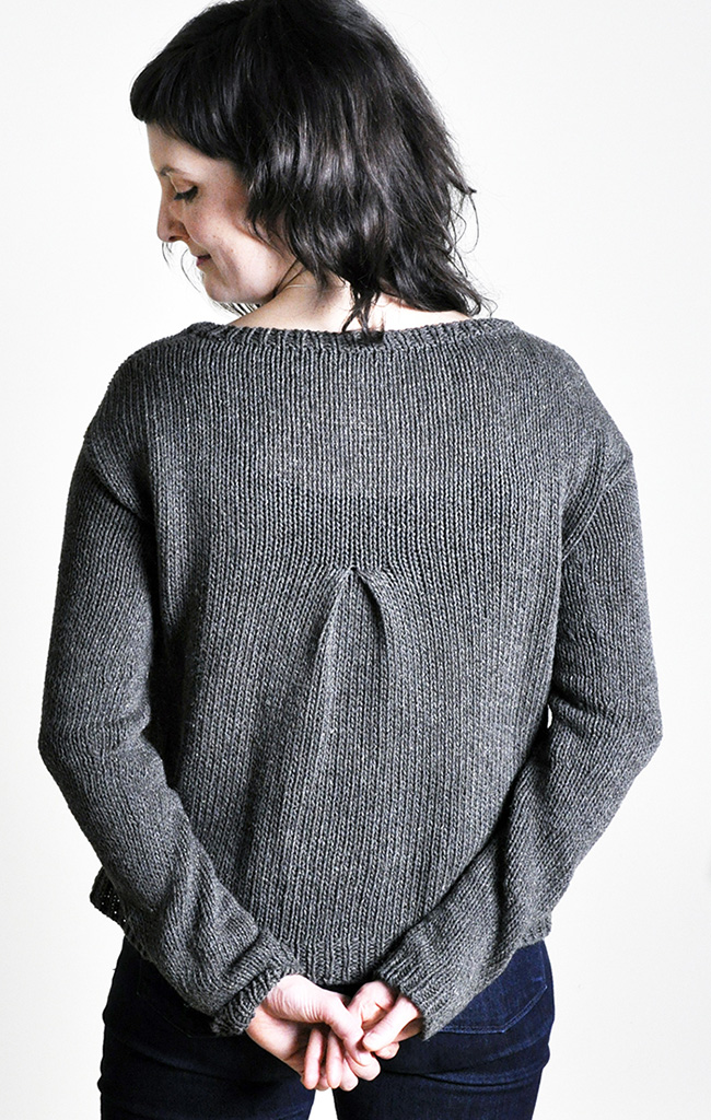 However, there are a few slightly tricky parts that really add a lot of style: a tubular cast-on and bind-off start and finish your ribbing beautifully, three organic-looking welts on the front skew the hemline in an interesting way, a box pleat on the back adds a bit of swing, and short-row shaping provides a better fit at the shoulders.