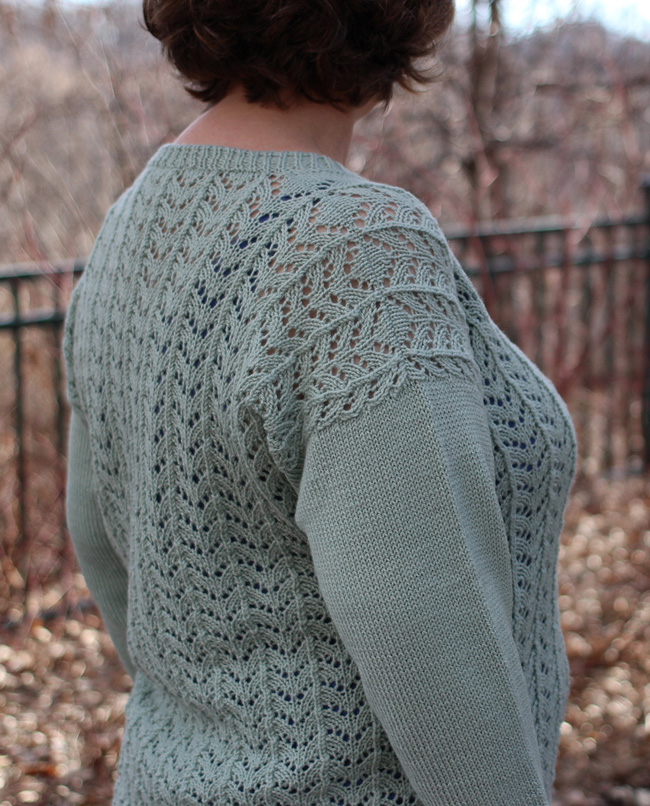Worked from the bottom up, this sweater is virtually seamless, with the sleeves picked up and knit in the round and the shoulders completed with a 3-needle bind off. The collar is picked up last and worked in the round. The stitches for the sleeves are picked up from the finished body and knit in the round to the cuff making such a pretty finish at the shoulders. Bracelet length sleeves, worked in stockinette, become a backdrop to the lace texture and are just the right warmth for cool fall days.