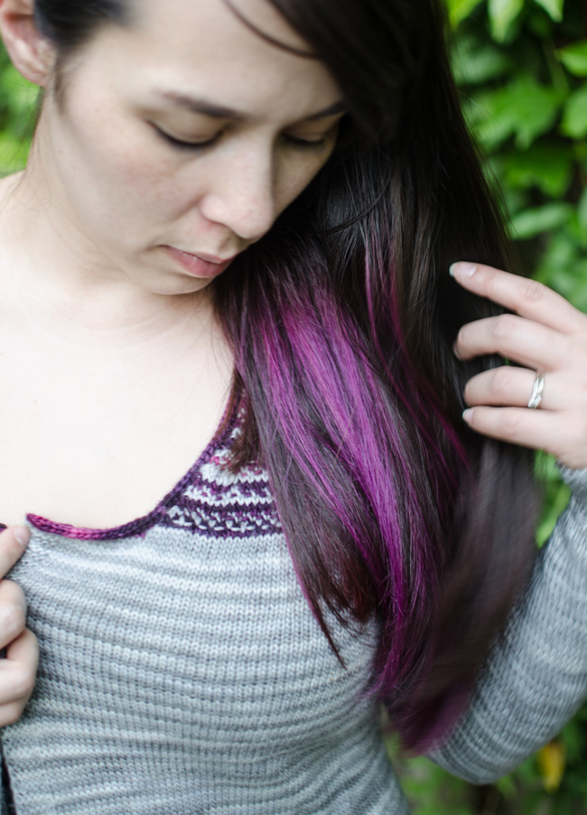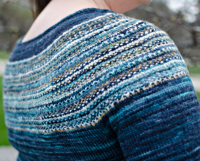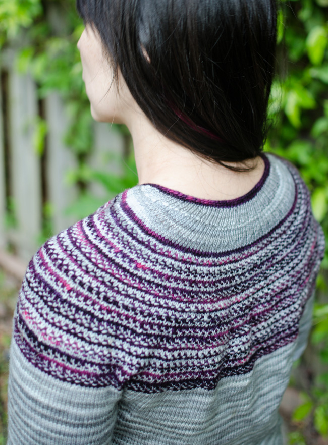 Choose a shaded solid for the main color and a variegated yarn for the contrast color to create the trompe l'oeil fair isle effect in the yoke - no need to wrangle several colors of yarn as you knit. The magic is in the easy-to-memorize slip-stitch pattern! You can also substitute a handspun yarn for your contrasting color to create an equally stunning effect.