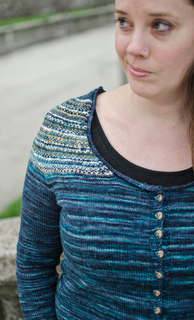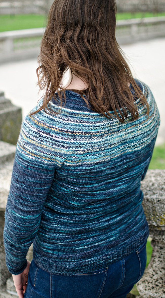 A yoked cardigan never goes out of style, and Bosco is designed to maximize the unique qualities of hand-dyed yarn.