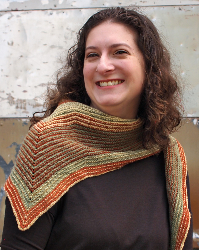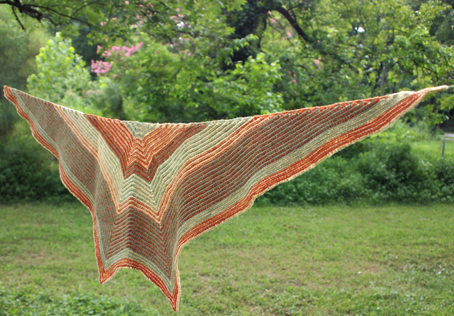Longwing has two sides. Because of the way this particular stitch pattern curls into ridges (technically known as welting), each color in a given section will be more visible on one side than the other. My original is a shawlette, but the pattern can be knit bigger or smaller as desired.