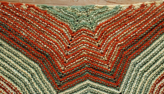 I used three colors, but the basic shawl can be knit in two or more colors; it would also make an excellent scrap yarn shawl.