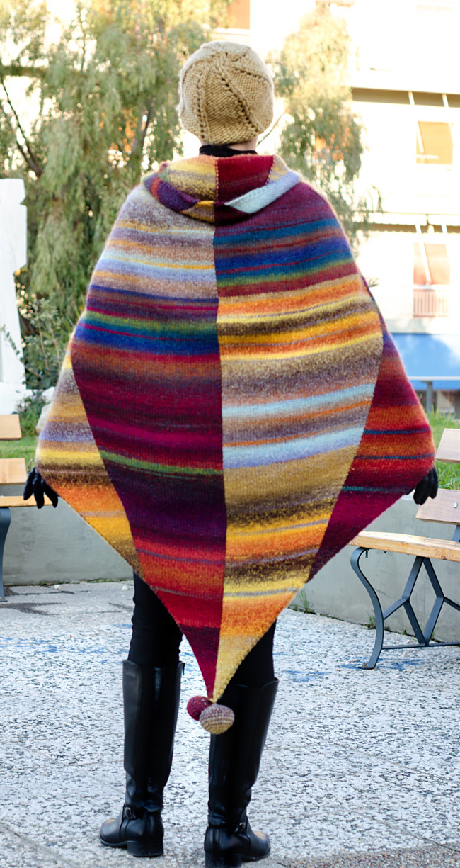 The result is a rhombus, a versatile shape that can be used in various ways. With a few buttons attached, it is transformed to a cape. Without the buttons, it can be used as a lap blanket or throw. The same shape worked in fingering or laceweight yarn can produce an elegant wrap. To make it a bit more fun and help the shape keep its drape, a pair of stuffed crochet balls can be added to one (or every) edge. I have opted to avoid pom-poms, as they get destroyed easily, and because crochet balls are not just durable, they also highlight the yarn's color changes.