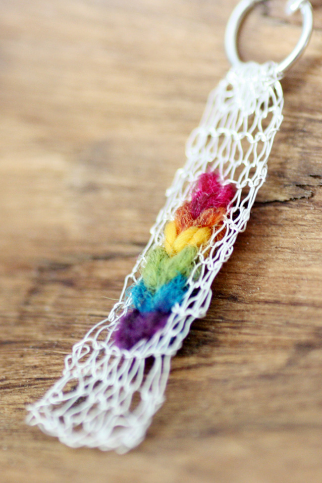 Using duplicate stitch, and beginning half an inch from the bottom of knitted wire piece, sew knit stitch “hearts” in the order of violet on bottom, blue, green, yellow, orange, and red on top. Use superglue to stabilize ends on wrong size, and then trim ends as flat as possible.