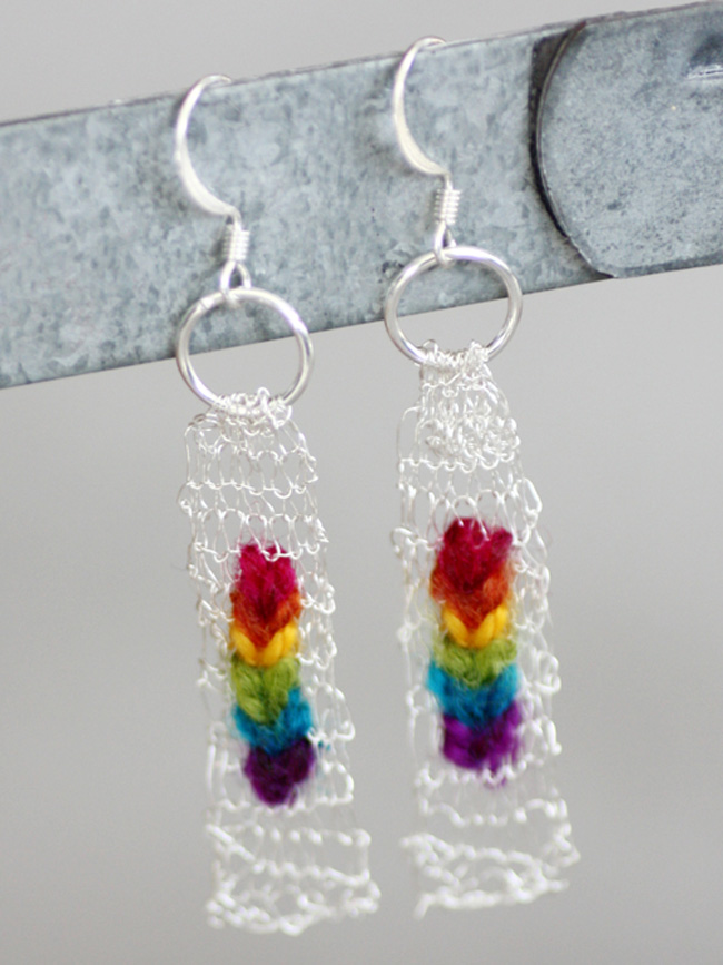 What the World Needs Now, a free knitting pattern from Knitty.com. Free knitting pattern for a delicate pair of wire earrings with single-stitches in a rainbow.