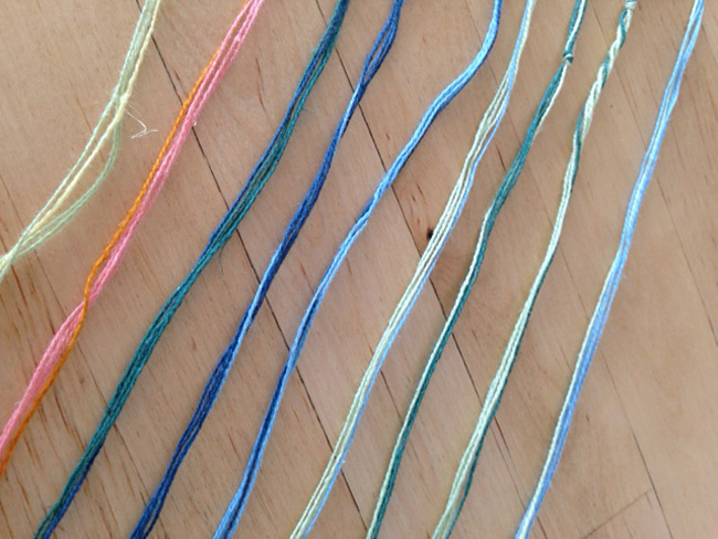 You can get some idea about how colors will interact with one another on the loom by twisting them together. I'll take two, three, or four different colors and twist them together in proportion to how I'm envisioning using them and see what the overall color effect is.
