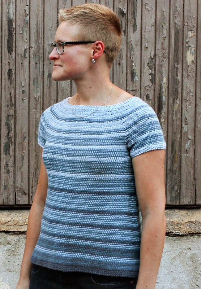 The top is worked seamlessly in reverse stockinette from the top down, starting with a circular yoke that switches to raglan shaping before dividing for the sleeves, and worked with the wrong side out so you do not need to purl, except for the garter stitch edges. Leave yarn ends on the outside (WS) and turn work once finished to leave reverse stockinette on the right side. The A-line shape gives more room for the play of colors. The gradual change from lighter to darker colors keeps you interested, but is still easy to knit. Choose four recycled stonewash denim shades or create your own combination!