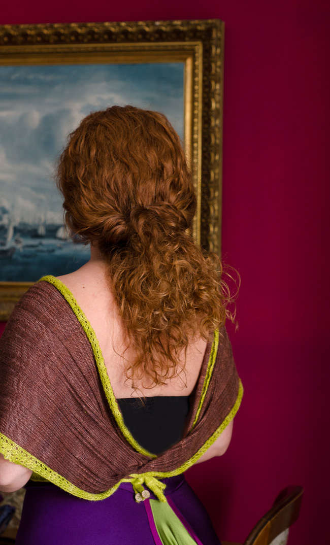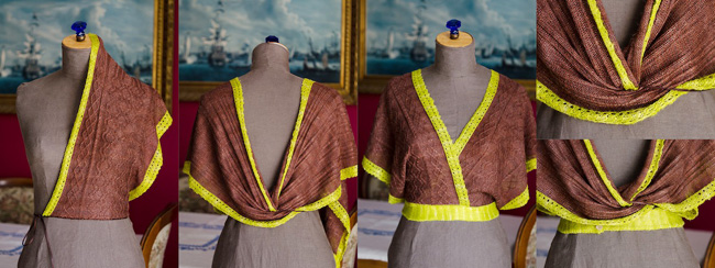 I also wanted to create a garment that can be used in many different ways. As a long rectangular piece, it can be worn as a stole (when not adding the waist bands) or as a very delicate summer top in different wrapping variations. Below I present one way to wrap, but I encourage you to explore and discover more ways!