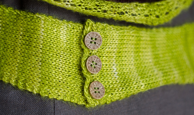 First three sizes only, next row, create buttonhole [RS]: K3, work one-row buttonhole (see Pattern Notes), k2, work Buttonhole, k to end of row.