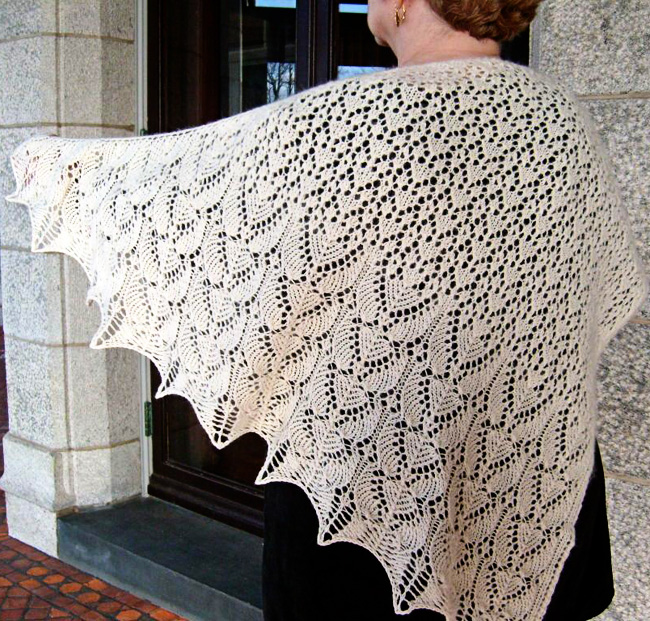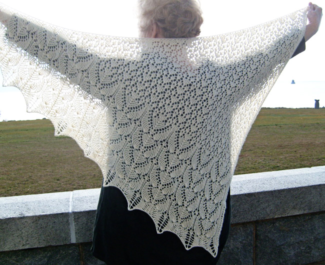 I designed this shawl to honor the many traditions of lace knitting.  As I designed the shawl, I imagined the multitudes of knitters from the past:  professional  guild knitters, cottage knitters augmenting family incomes, and the many knitters who clothed their families with their handiwork.  Using elements from Estonian and Shetland heirloom designs, I "borrowed"  memories from past knitters to develop a new stitch pattern which remains visually reminiscent of traditional origins.