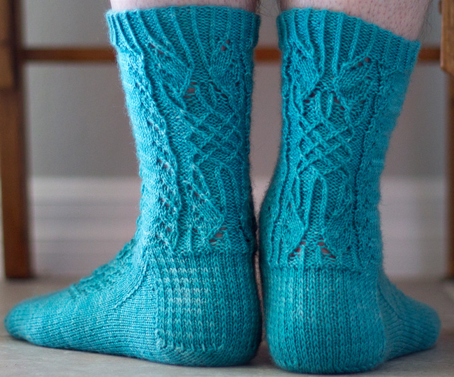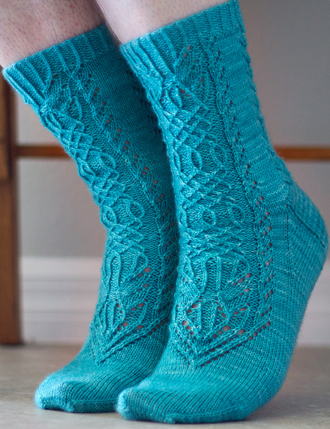 These socks won’t blind you or turn you into a rock, but they do make me think of nymphs. Theres something about the combination of a bit of lace with those 2 stitch cables that brings to mind woodland fairies, sprites, and nymphs.
