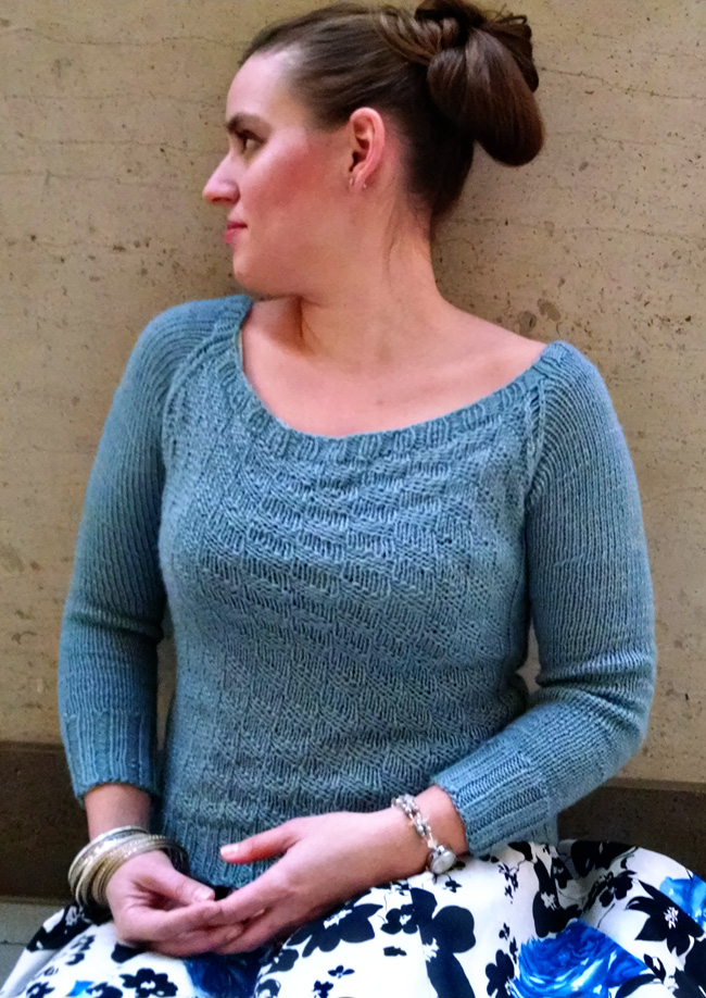 A wide necked pullover featuring a softly textured pattern on the body with smooth stockinette sleeves, this top is a perfect project for splurge-worthy yarns. Gently fitted to follow natural curves, this pullover is delightful to snuggle up in. While the fit of the body creates an elegant outline, the three-quarter length raglan sleeves add a relaxed, casual feel to the whole project.