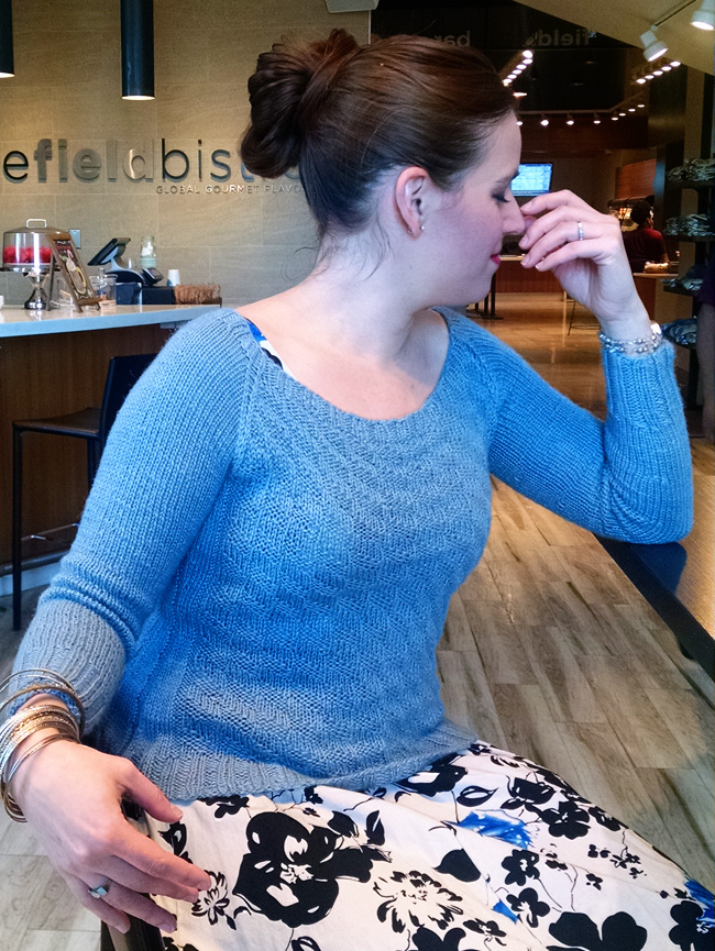 The Checked Raglan is worked in the round from the bottom up, with the sleeves being attached to the the yoke using Raglan shaping. A short raglan length ensures a flattering neckline with pretty, squared-off corners.