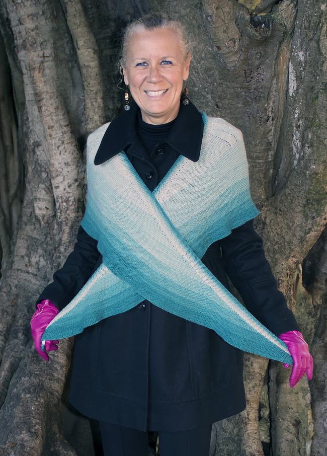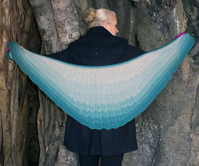 Worked from the bottom up with stepped shaping along the long ends, chevron repeats are gradually added, helping to curve the wrap around your shoulders and adding visual interest. Top the whole thing off with a shaded band that provides emphasis and contrast and assists with the graceful curve.
