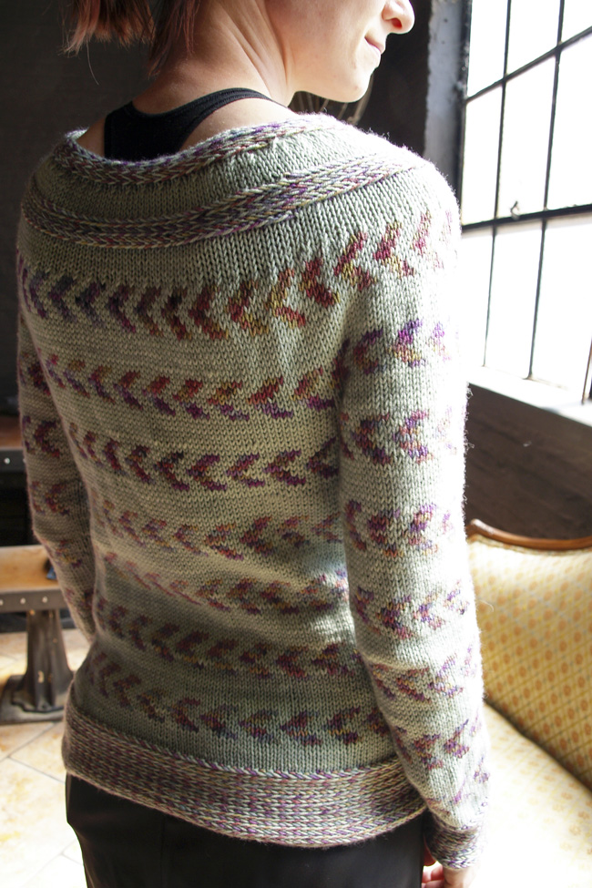 Baltimore Tea Party is a micro-macro experimentation with pattern, color, and texture: The arrow pattern on the body and sleeeves is the large-scale version of the twisted stitches around the hem, cuffs, and collar.
