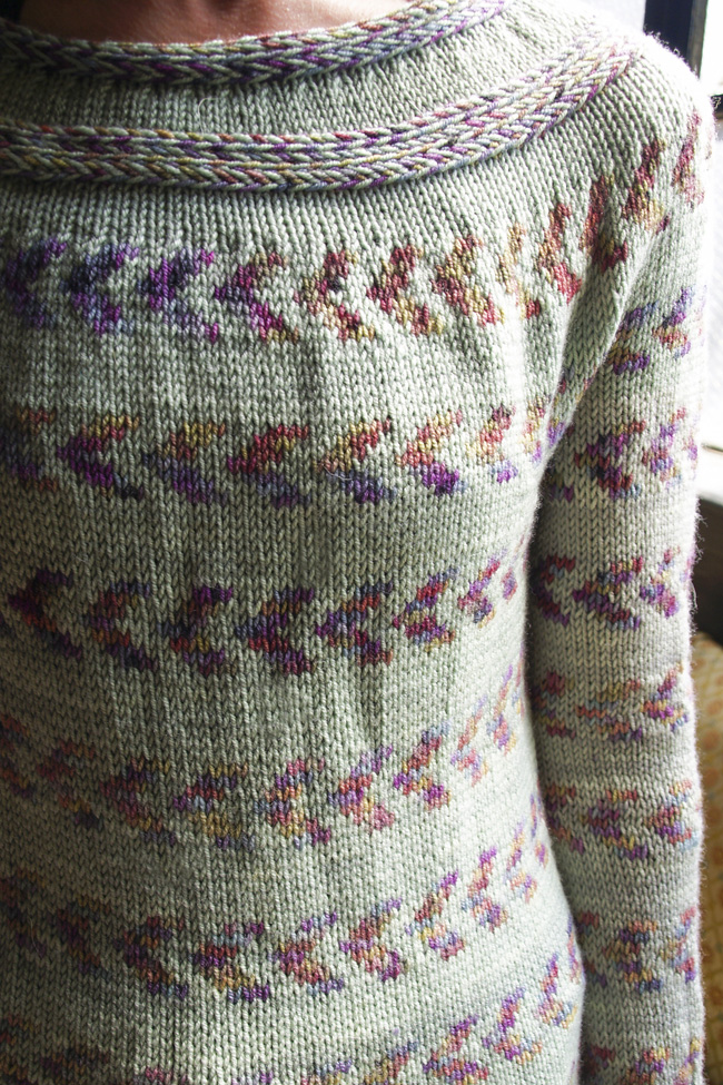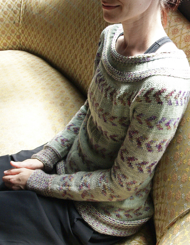 Baltimore Tea Party, a free knitting pattern from Knitty.com. Free knitting pattern for a Fair Isle colorwork pullover with integrated braid trim, using softly variegated yarn.