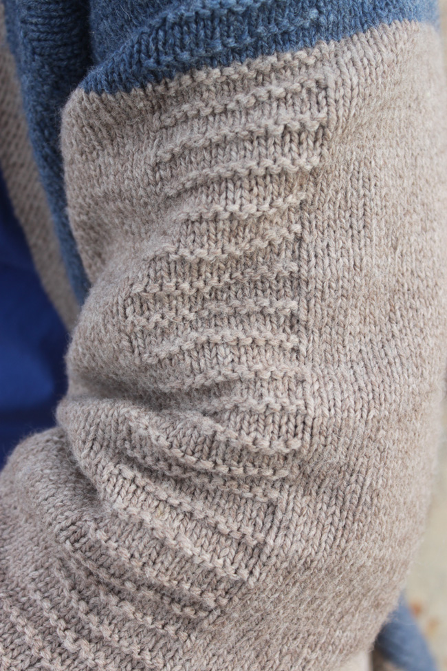 Colorado, a free knitting pattern from Knitty.com. Free knitting pattern for a unisex cardigan with contrast-colored textured sleeves.