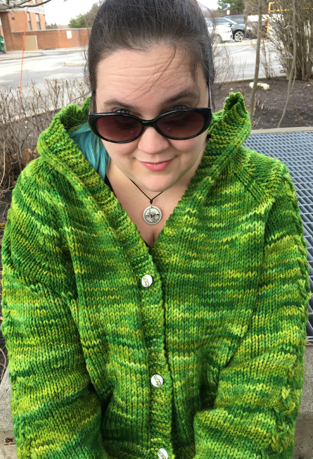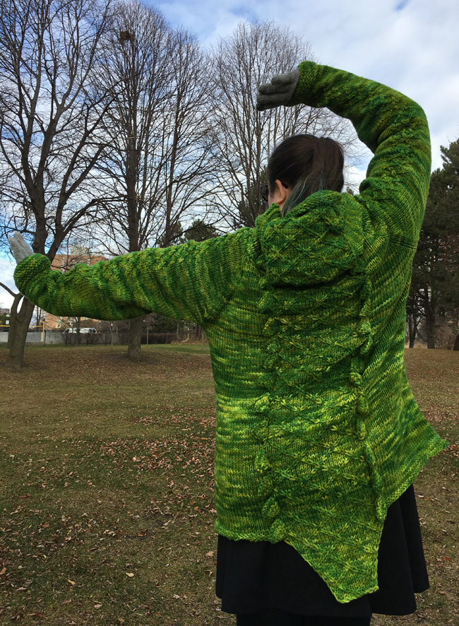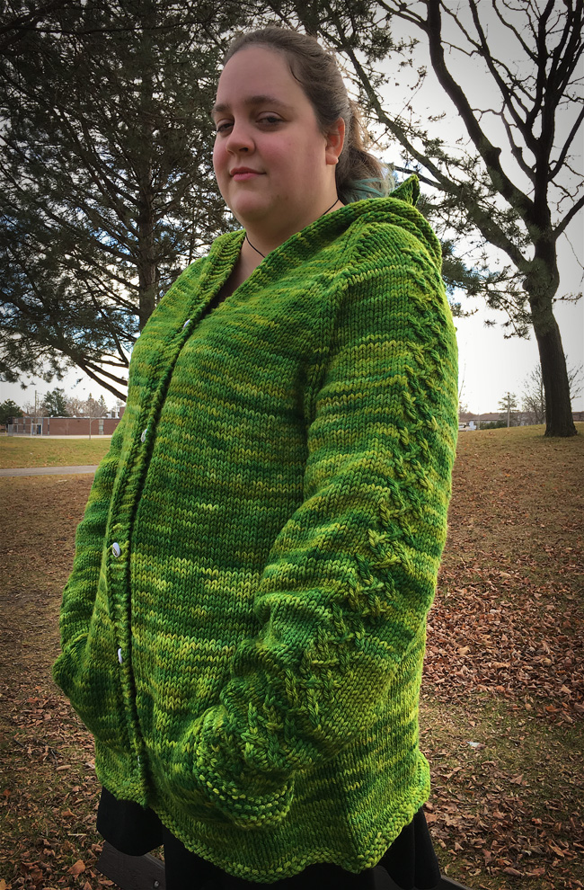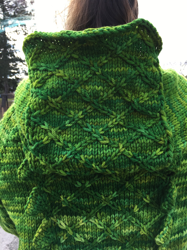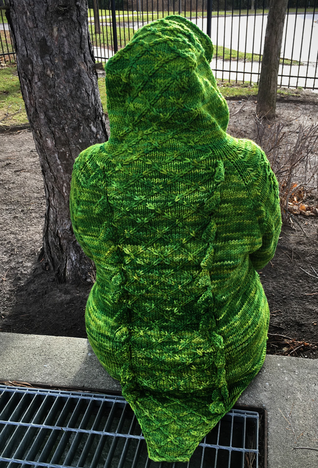 This is a straightforward agender cardigan with a cabled back panel and uniquely constructed spines to turn you or your loved one into a fearsome crocodile with a comfy deep hood and huge pockets. It is knit seamlessly from the bottom up, with practically no finishing.