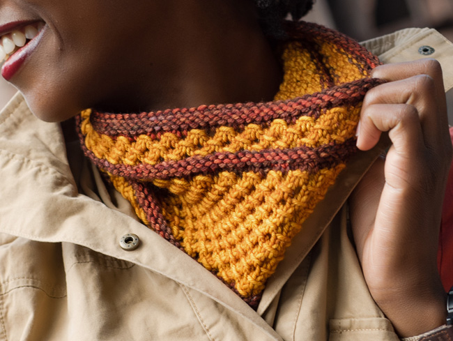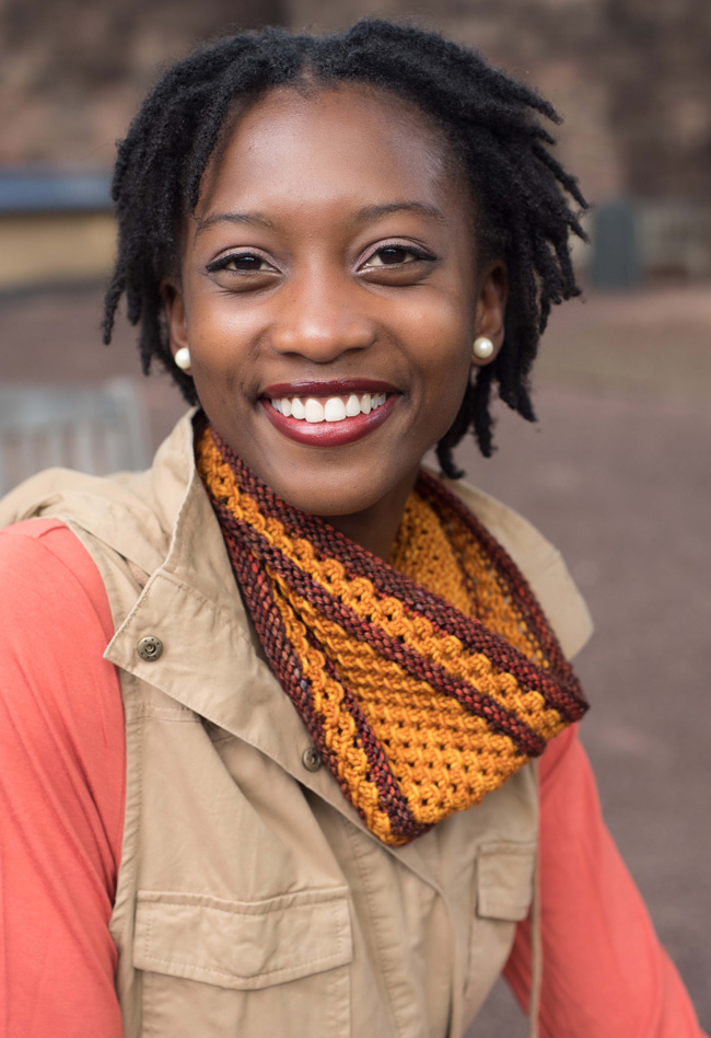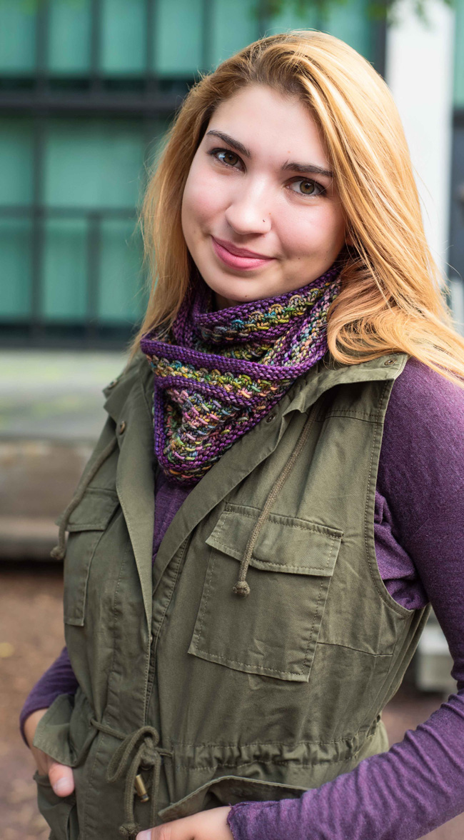 Using worsted weight yarn, the cowl makes for a very quick knit – just right for gift-giving. The loop does double-duty as a scarf or, wrapped twice, a warm and cozy cowl.