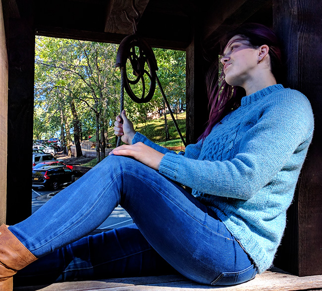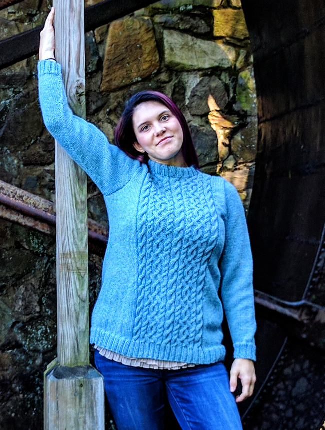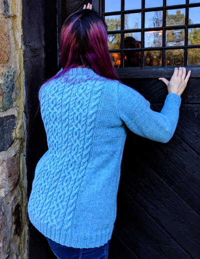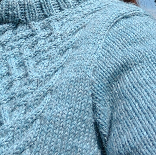Liberty is worked flat from the bottom up in pieces, and then seamed. The ribbed neckband can be worked to different lengths depending on the desired effect.