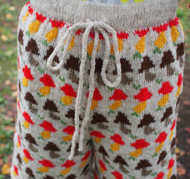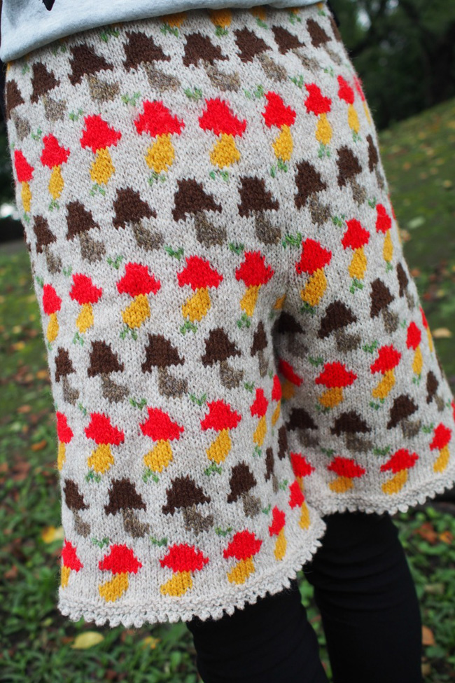 Pantashrooms, a free knitting pattern from Knitty.com. Free knitting pattern for a pair of mushroom-covered knee-length pantaloons with a picot hem.