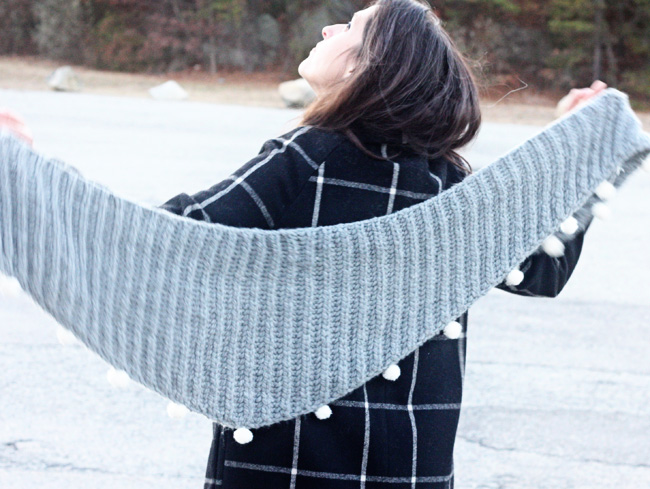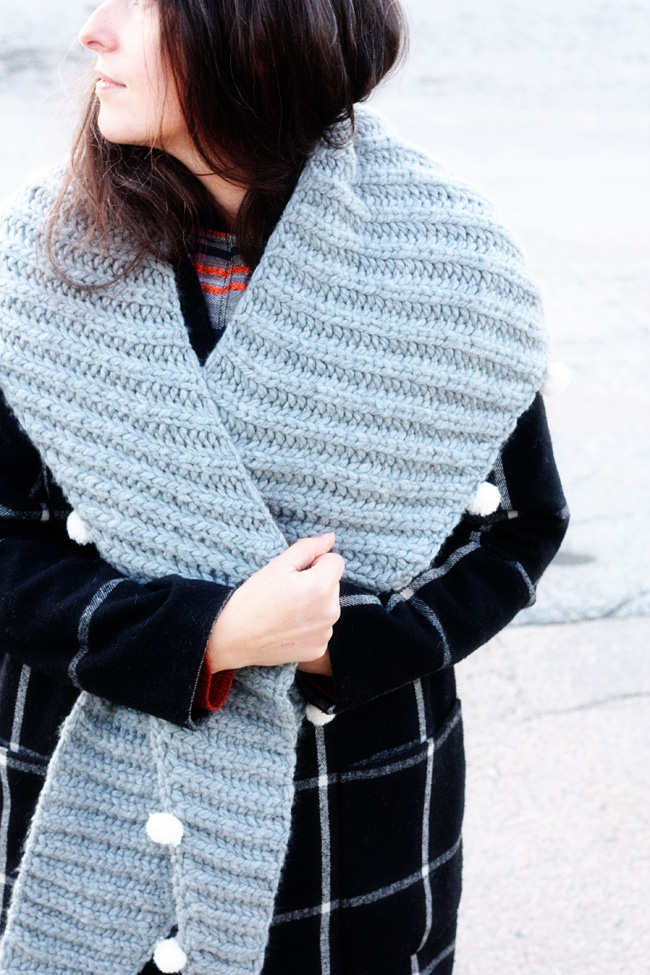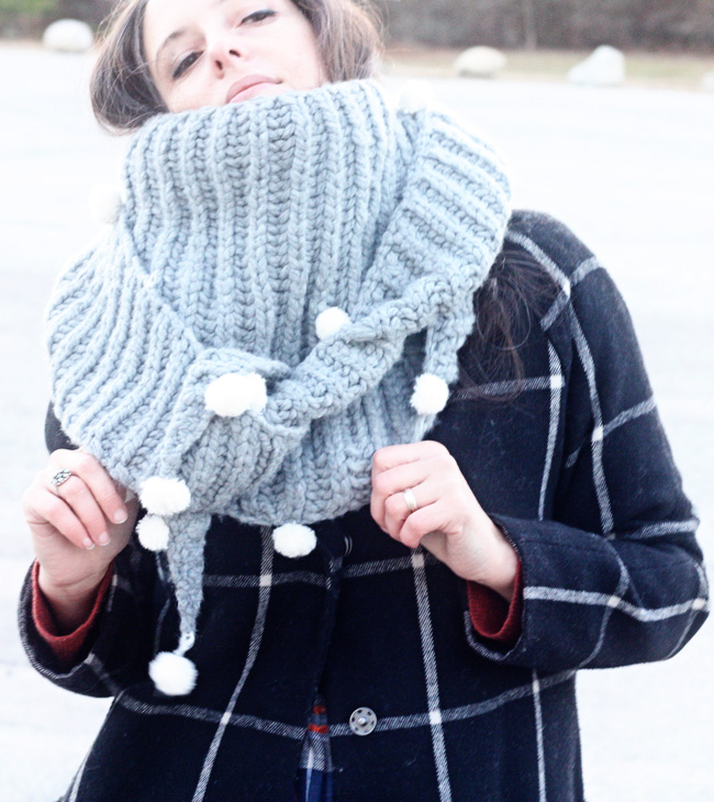 You cast on and knit until you’re done (or run out of yarn). It is also a good introduction to working with Brioche stitch. You begin with only a few stitches, but working regular Kf&b increases as you go, it quickly grows into a lofty textural rib, accented with snowball-like pompoms that will keep you as warm and cozy as a quilt when the snow falls.