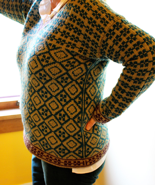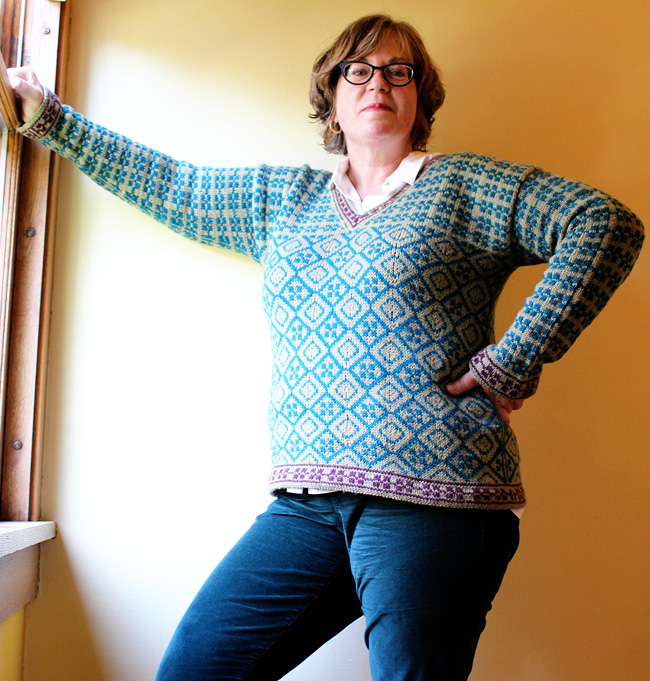 This sweater began as an experiment: could I create a sweater with an all over pattern in stranded colorwork, which I love, without steeking, which I do not?