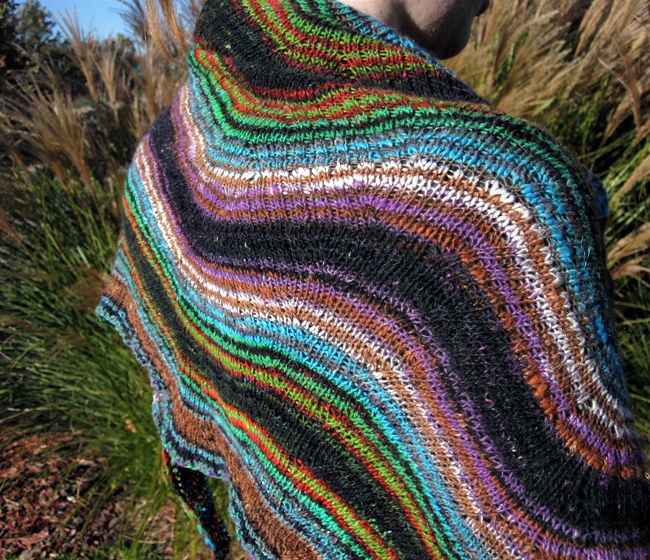 The idea for this shawl came to me when I was browsing designer knitwear collections for inspiration, and saw a M Missoni sweater with wavy stripes. I thought that the stitch had to be a closed version of feather and fan, but decided to take a look at the other photos of the sweater anyway. Upon inspection of a close-up detail shot, I realized that the stitch pattern was more akin to that of the iconic Cookie A. sock pattern, Monkey, albeit stretched much wider. So this shawl pattern is a loving tribute to both Missoni and the Monkey socks. The name of this pattern is a nod to the matriarch of the Missoni clan.