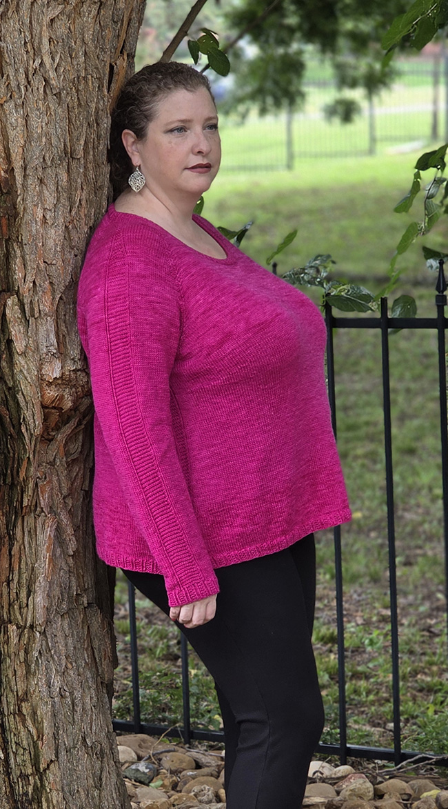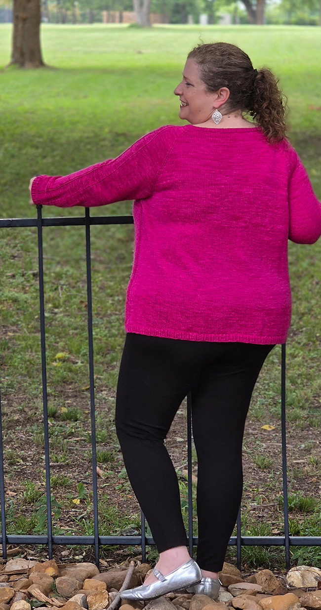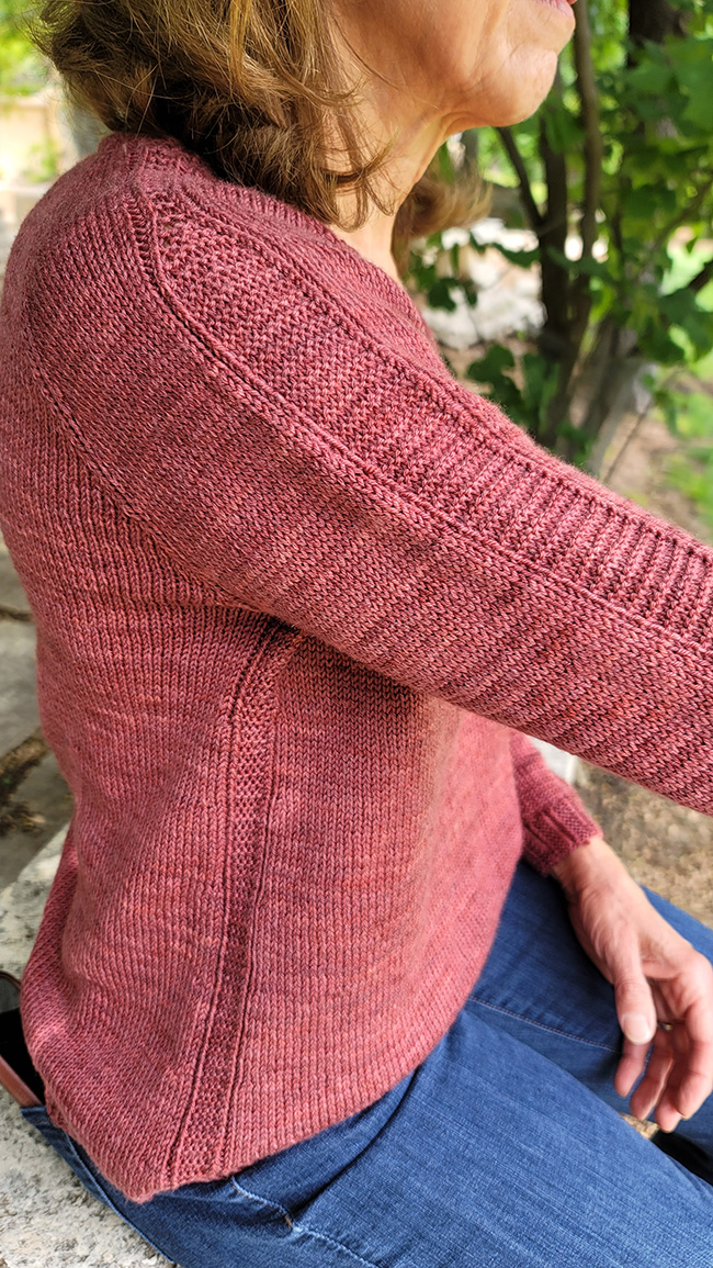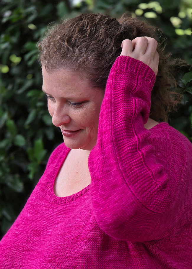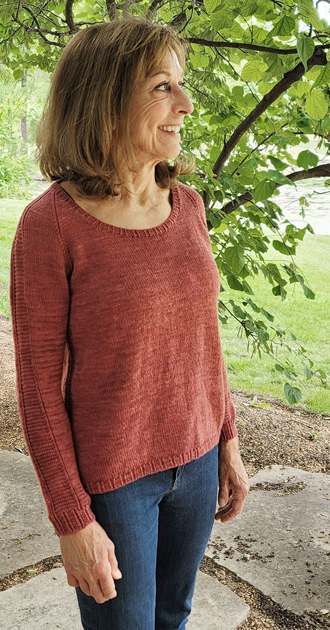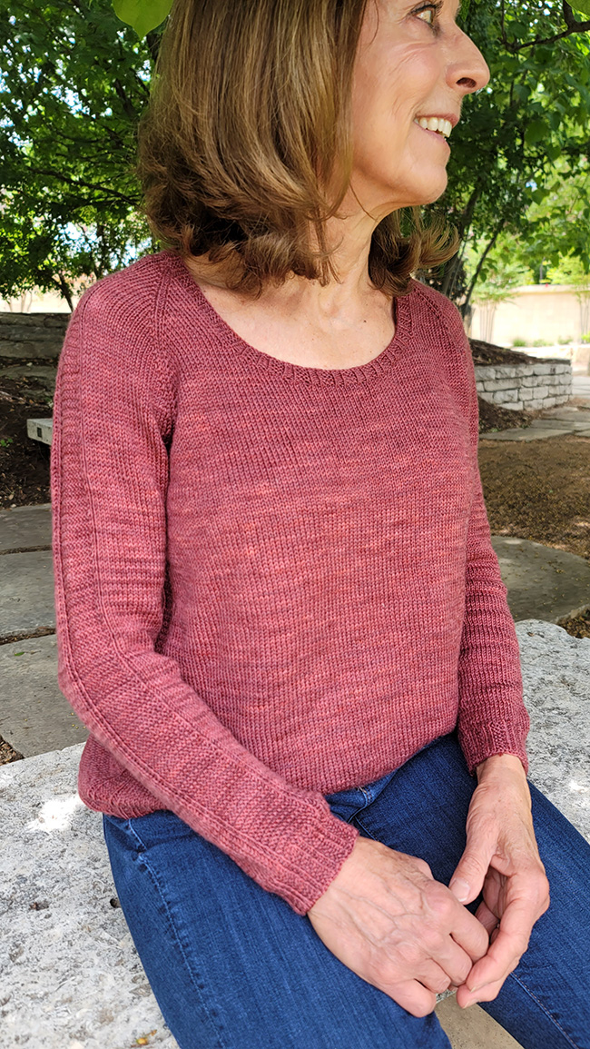 Lustra is a relaxed, swingy slightly A-line top featuring sleeve and faux seam texture stitching. Created top-down in the round, Lustra has a deep scoop neckline and falls gracefully to the hip.