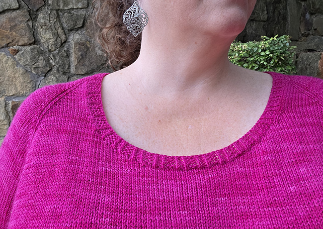 Construction Method: This top is cast on at the neckline and joined to work in the round from the top down. The sleeves are put on hold and picked up to work after the body is complete. Finally, the neck stitches are picked up and finished in the round.