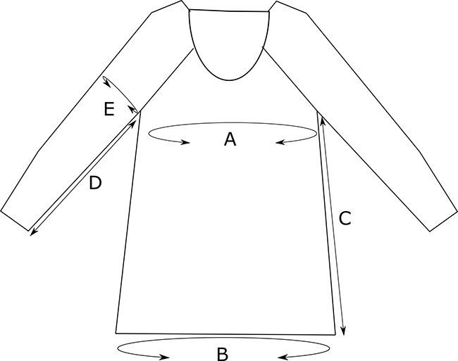 E – Upper arm circumference: 10.5[10.75, 11.75, 12.25, 12.5, 13.25, 13.5, 14, 14.5, 15.25, 16.25, 16.75, 17.25, 18, 18.5] inches/ 26.5[27.5, 30, 31, 32, 33.5, 34.5, 35.5, 37, 38.5, 41.5, 42.5, 44, 45.5, 47] cm