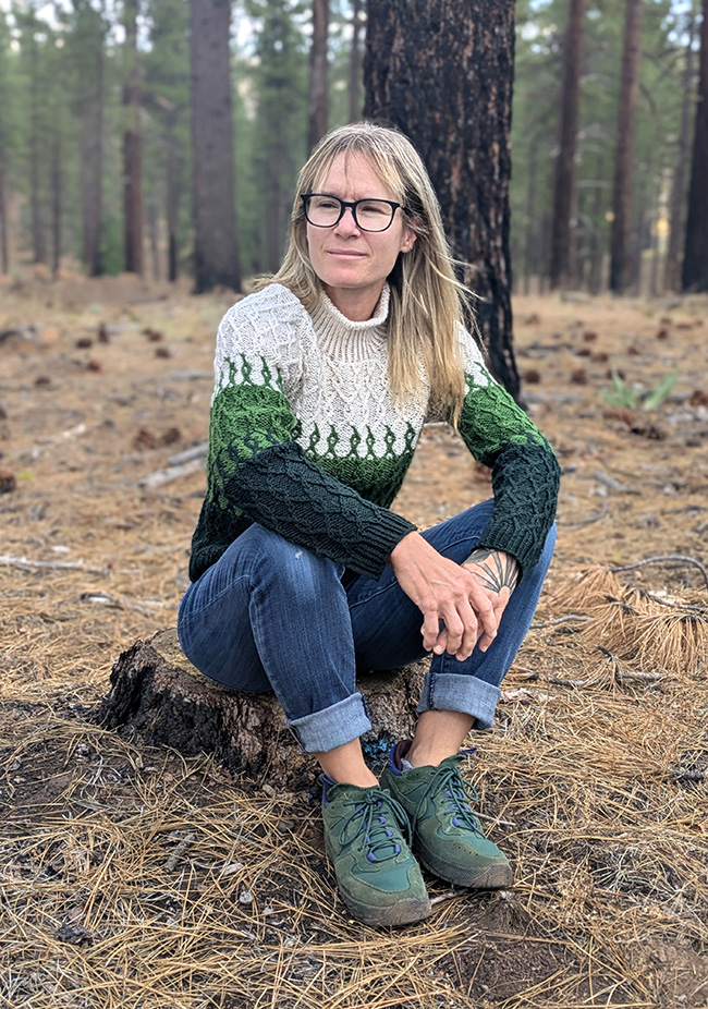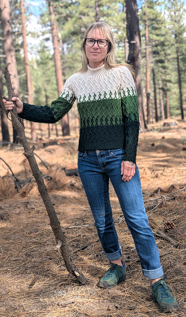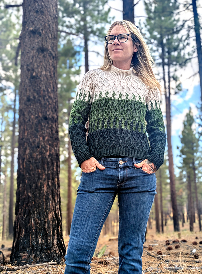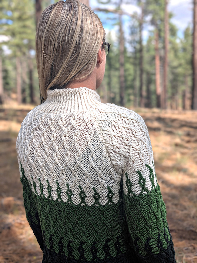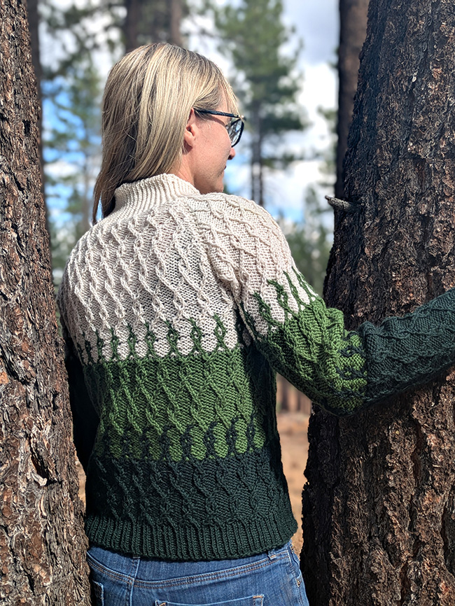 Inspired by the beautiful forestry of the Sierra Nevadas, Between the Trees blends three colors in a gradient fashion. The Twisted Trees stitch pattern is worked with a single color in some instances, and in two colors during the blending sections. During these "blending sections", hold both colors together throughout the round, changing colors using the stranded method. And don't worry – there are no color changes done flat – only in the round!