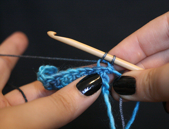 Usually when we start a row or a new color, we use a slip stitch to attach the yarn, then chain up to the proper height (1 chain for sc, 2 chains for hdc, 3 chains for dc, and 4 for treble crochet), but that's not strictly necessary. Instead we can use a standing stitch to start the row. In this case, we need a sc.